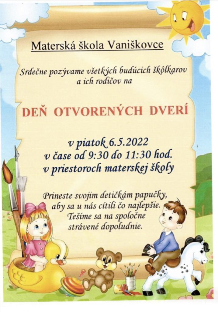 Materská škola Vaniškovce srdečne pozýva budúcich škôlkarov a ich rodičov na deň otvorených dverí dňa 6.5.2022 (piatok) v čase od 9:30- 11:30 v priestoroch MŠ. Nezabudnite si papučky, aby ste sa cítili čo najlepšie.