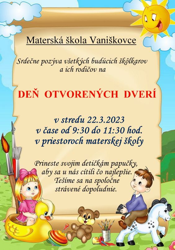 Materská škola Vaniškovce srdečne pozýva všetkých budúcich škôlkarov a ich rodičov na deň otvorených dverí. Ten sa uskutoční v stredu 22.marca 2023 v čase od 9:30 do 11:30 v priestoroch materskej školy.