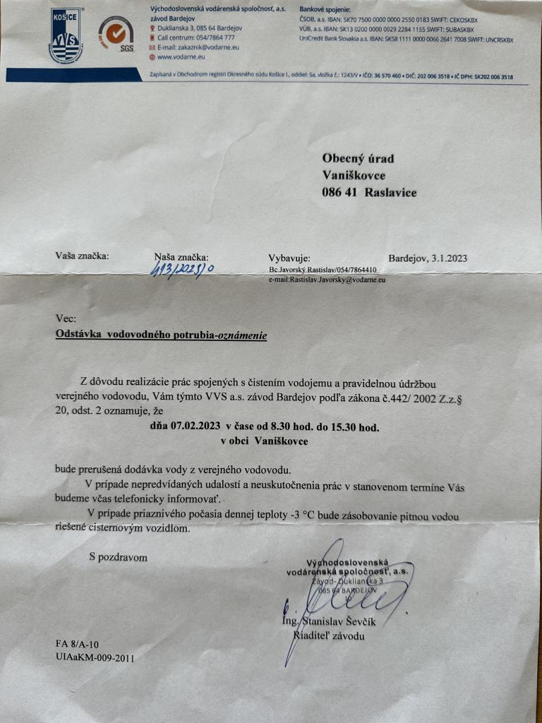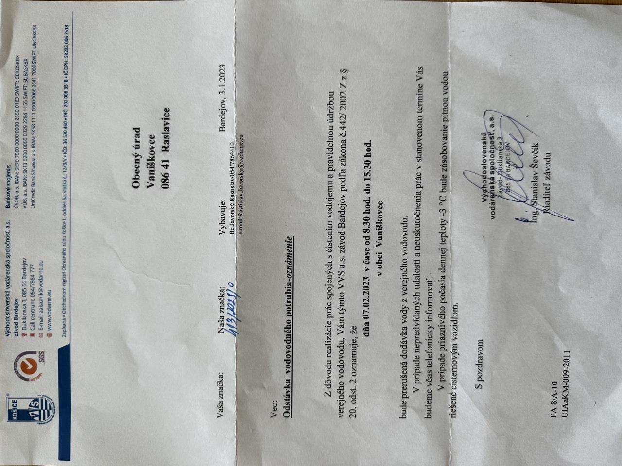 Vážení občania, z dôvodu realizácie prác, pravidelného čistenia a údržby verejného vodovodu, bude dňa 07.02.2023 (t.j. v utorok) v čase od 8:30 do 15:30 prerušená dodávka vody z verejného vodovodu.