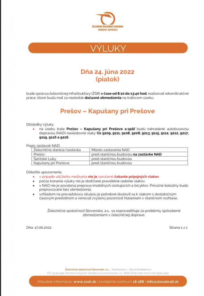 Dňa 20.júna (pondelok) a 24.júna (piatok) na trati Prešov- Kapušany pri Prešove budú dočasné obmedzenia vlakovej dopravy. Na tejto trase bude premávať náhradná autobusová doprava. Viac v prílohe.