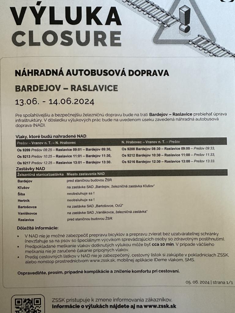 Oznam o výluke železničnej dopravy v úseku trate Bardejov – Raslavice od 13. 6. do 14.06.2024. Náhradná autobusová doprava nebude obsluhovať TB Šiba a Hertník. Bližšie informácie nájdete na obrázku.