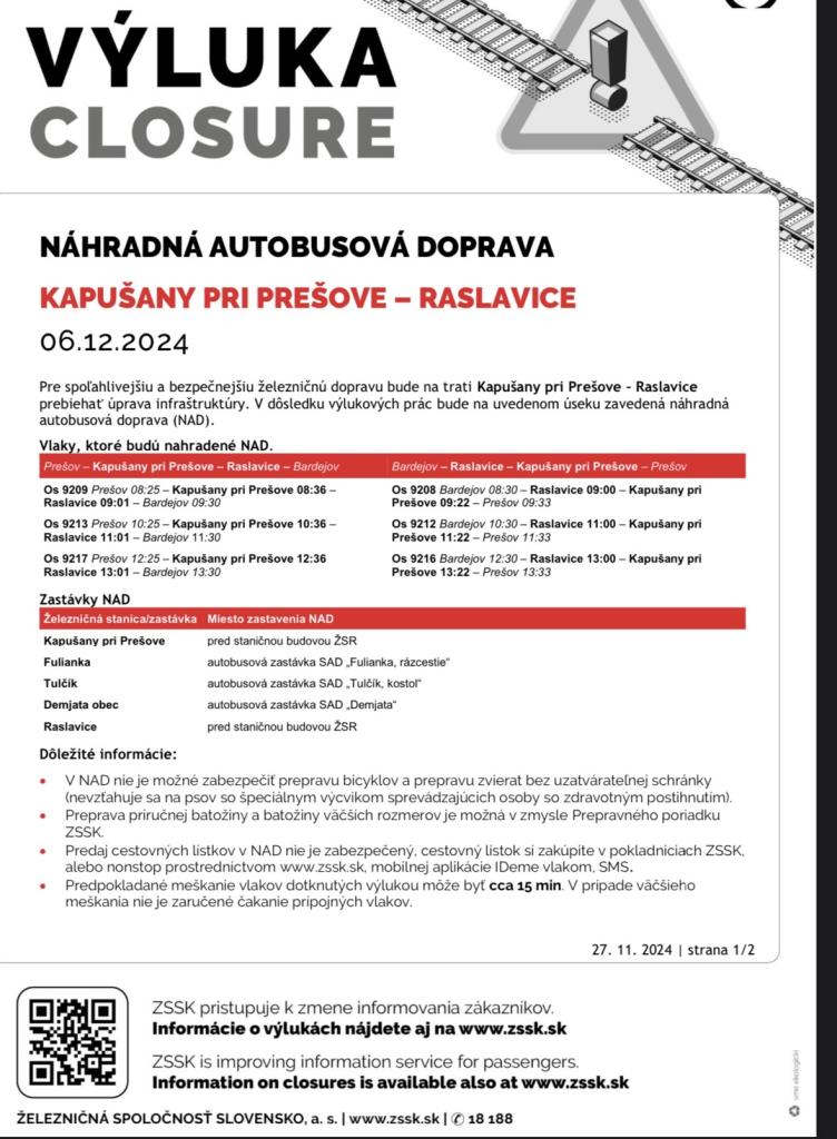 ZSSK upozorňuje na výluku na trase Kapušany pri Prešove – Raslavice (dňa 6.12.2024 od 8:00 do 14:00 hod.) Bližšie info nájdete na priloženom obrázku.