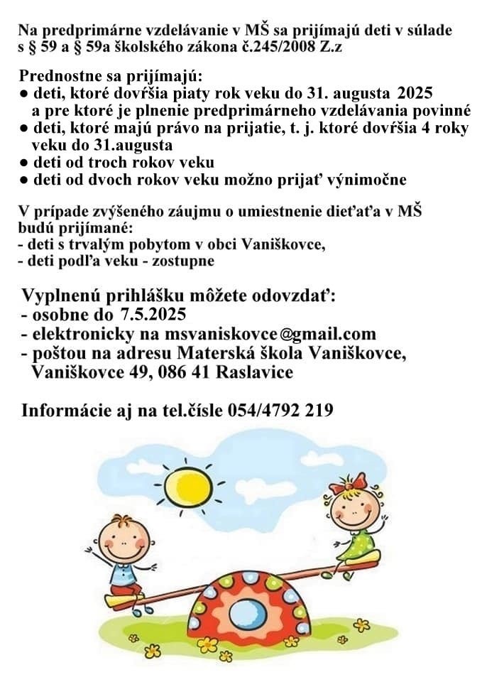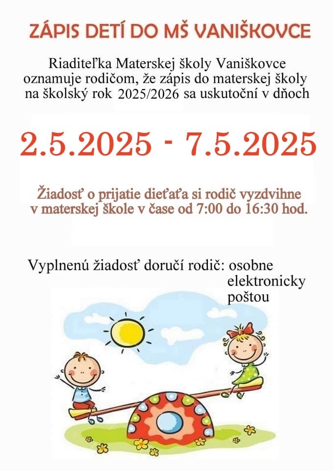Zápis detí do Materskej školy Vaniškovce prebehne v dňoch 2. až 7. mája 2025. Vyplnenú žiadosť je potrebné doručiť osobne, elektronicky, alebo poštou.