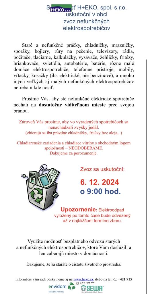 V piatok 6.12.2024 sa o 9:00 uskutoční v obci zber nefunkčných elektrospotrebičov, ktoré je potrebné vyložiť na dostatočne viditeľné miesto pred svoju bránu. Bližšie informácie na priloženom obrázku.